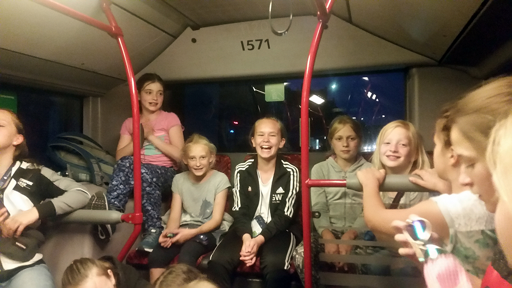 Beim Schauwettkampf wurden uns fünf verschiedene Arten des Turnens gezeigt: rhythmische Sportgymnastik, Balken turnen, Trampolin turnen, Reck turnen (männlich) und Aerobic. Am nächsten Tag hatten die Turnerinnen des vorherigen Tages einen Jugendwettkampf, wobei sie Sprünge auf dem Minitramp ausführen mussten. Außerdem mussten sie eine Bodenkür vorführen, Weitwurf, Sprint, Standweitsprung und eine Überraschungsaufgabe bewältigen. Die Turnerinnen aus dem Jahrgang 06/07 erreichten den 1. Platz und die Turnerinnen aus dem Jahrgang 04/05 den 4. Platz (hatten aber mehr Punkte). Mittags waren wir bei einem Chinesen, dort haben einige Nudeln gegessen, der Rest ist zu McDonald´s gegangen. Nachmittags hatten die Turnerinnen des Jahrgangs 08/09 ihren Wettkampf. Abends wollten wir die Turnfestmeile anschauen. Leider hatte sie schon geschlossen :-( , so dass wir beschlossen, am nächsten Tag noch mal wieder zu kommen. Anschließend liefen wir trotzdem noch an der Turnfestmeile entlang. Als wir an der Airtrackhalle vorbei liefen, merkten wir, dass die freiwilligen Helfer noch an der Halle saßen. Leonore hat sie schließlich dazu überredet, dass wir noch in die Halle durften, also hatten wir die Halle ganz für uns allein. Für viele von uns war das ein persönliches Highlight. An unserem letzten Tag haben wir uns morgens einen Pokalwettkampf angesehen. Danach sind wir mit dem Bus zur Turnfestmeile gefahren und sind bei regem Betrieb hindurch gegangen. Nachdem wir durch die komplette Turnfestmeile gegangen waren, fuhren wir mit dem Bus ins Freibad. Als wir danach wieder bei der Schule ankamen, waren schon unsere Eltern da um uns abzuholen. Aber bevor wir gefahren sind, haben wir einen Kreis gebildet und jeder hat seine persönlichen Highlights genannt. Am häufigsten wurde die Airtrackhalle genannt.