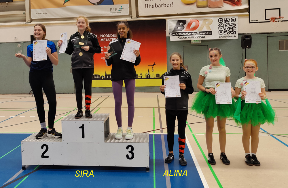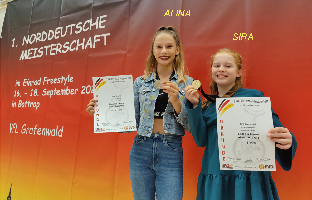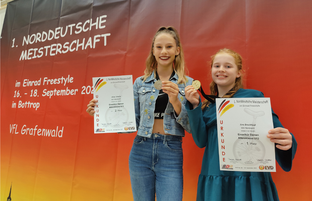 Nach langer Corona-Pause durften sich die Einradsportler:innen des SSV Nümbrecht endlich wieder über einen Meisterschaftstermin freuen. So ging es vom 16. bis zum 18. September für Sira-Maria Brockhaus (11), Alina Simara (12), Jonas Tomanek (15), Kim Lilien Höser (20) und Theresa Mausehund (20) zur 1. Norddeutschen Meisterschaft im Einrad Freestyle nach Bottrop zum VfL Grafenwald. Starten durften hier all diejenigen, die sich zuvor über die jeweiligen Landesmeisterschaften aus den oberen Bundesländern qualifiziert hatten, in NRW fand zu diesem Zweck vorab eine Video-Qualifikation statt.